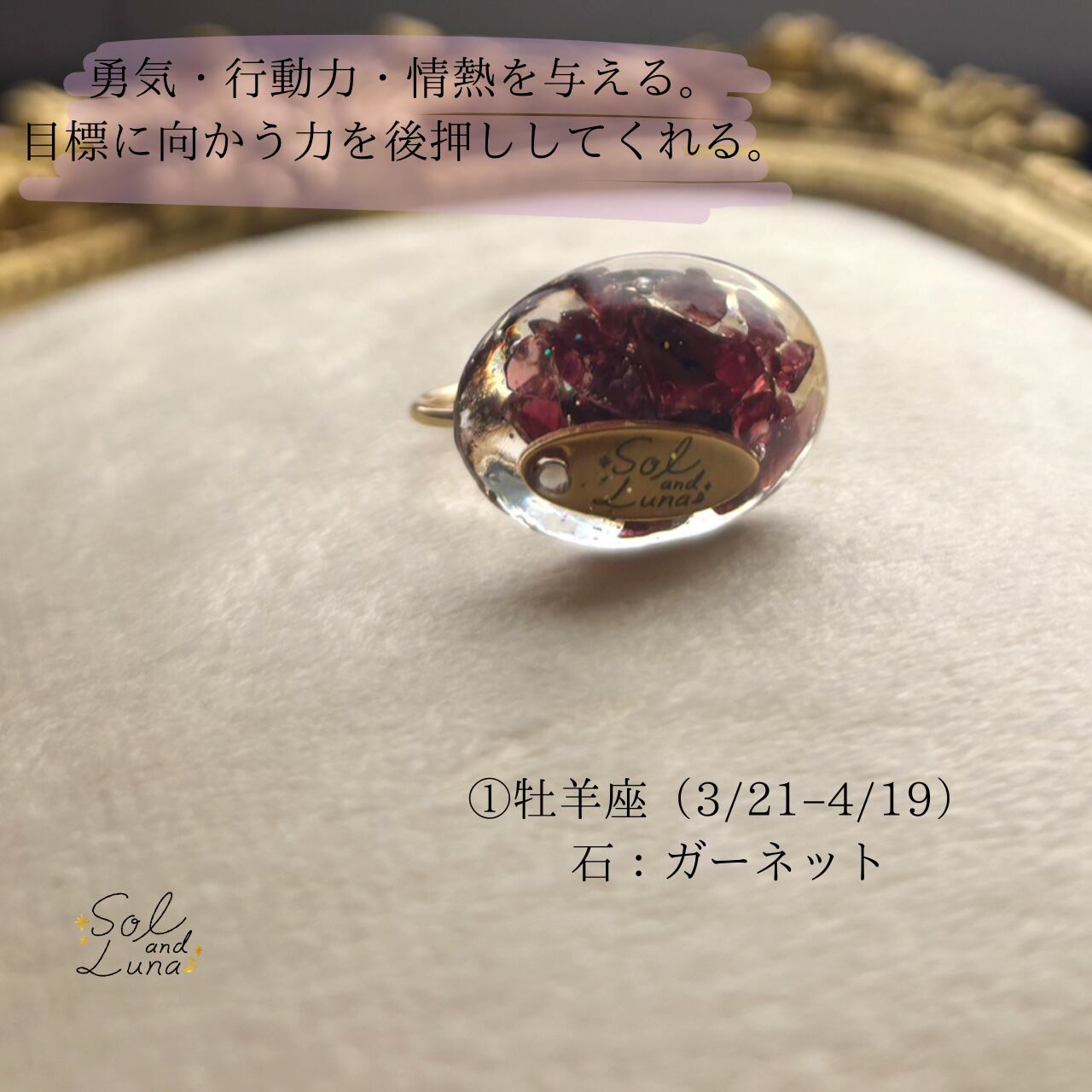 星座ごとの天然石を閉じ込めたオルゴナイトリング。