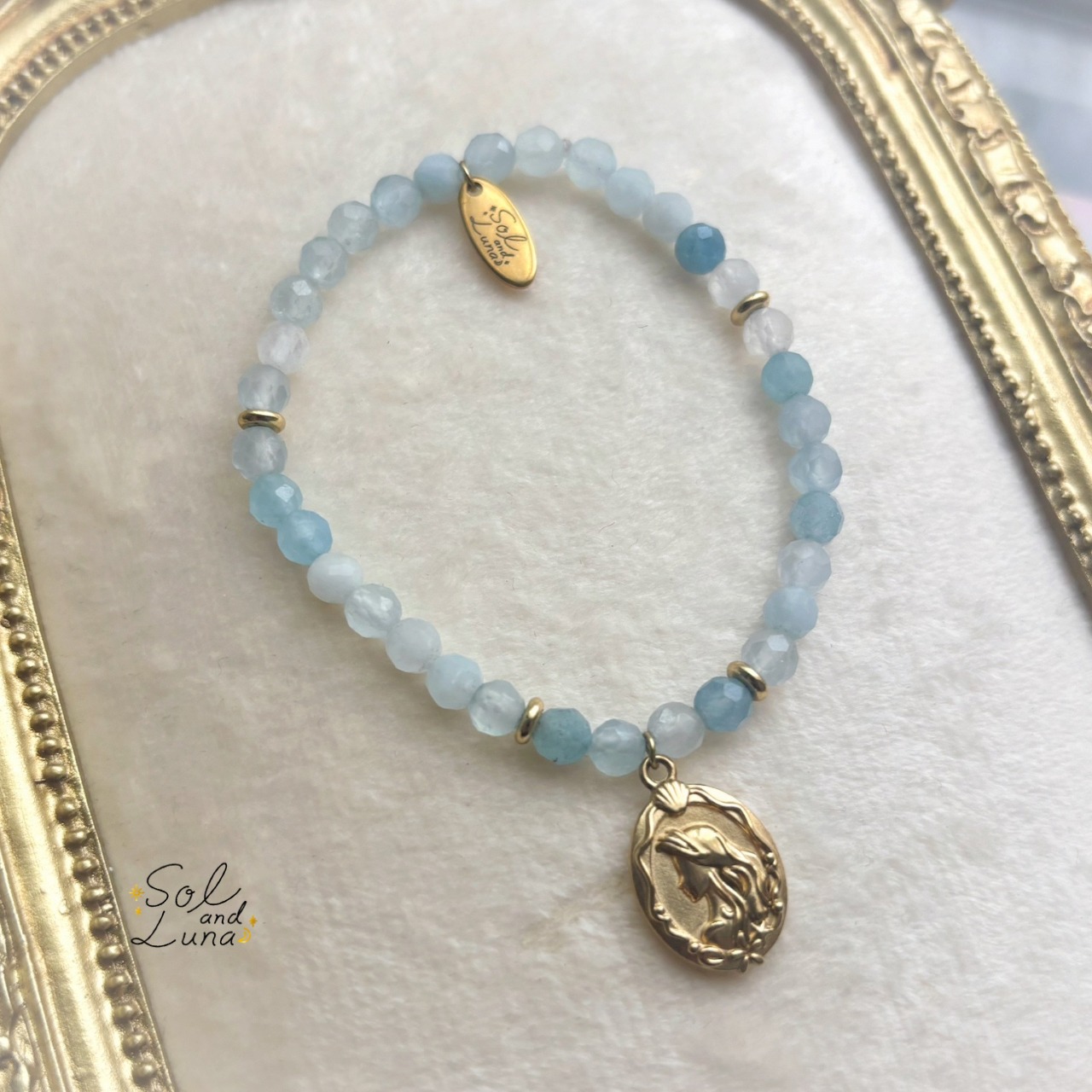 澄んだ海のようなアクアマリンと、マーメイドチャームが幻想の海を感じさせるブレスレットです。